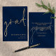 Anúncio de Graduação Dourada do Marinho de Script Elegante Esta simples tipografia dourada no design azul clássico do marinho para anunciar a notícia do seu formando tem um script de escrita manual de conjunto informal para o cabeçalho principal, formando e fácil personalização da tipografia no lado inferior direito com os seus detalhes e também a sua mensagem no verso.