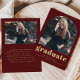 Este anúncio de formatura simples e minimalista apresenta uma foto em forma de arco na frente e uma foto horizontal na parte de trás. A palavra "formando" aparece em uma tipografia de cor dourada, com o nome do formando, a escola e o ano, em sans serif, em fundo burgundy. Adicione uma mensagem mais detalhada sob a foto no verso.
