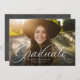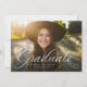 Um formando clássico e elegante em branco fica no fundo de uma foto horizontal. O texto personalizado inclui espaço para o nome do formando e também detalhes escolares e do ano. O backer da cinza de carvão negro tem um padrão de grade simples, e a cor pode ser alterada clicando em "personalizar ainda mais". Anuncie a realização do seu formando aos amigos e à família com este design!