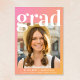 Cartão de anúncio de graduação cor-de-rosa e laranja, com uma fotografia do formando, "formando" em uma fonte branca grande e negrito e seu nome, escola e ano de aula em uma simples tipografia branca moderna.