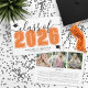 Um anúncio clássico, porém moderno, de graduação horizontal. A frente apresenta uma "Classe de" sobredimensionada em negrito com "2025" em laranja marcante para um contraste vibrante, acentuado pela escrita elegante de cinzas. Dois ícones de boné de formatura acrescentam um toque comemorativo, com espaço abaixo para o nome do formando e a escola. As cores podem ser personalizadas para corresponder às cores da escola para uma aparência personalizada. O verso mostra uma colagem de fotos com três pontos de imagem e espaço para uma mensagem sincera dos pais, destacando realizações e expressando orgulho.