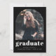Este anúncio de formatura simples e minimalista apresenta uma foto em forma de arco na frente e uma foto horizontal na parte de trás. A palavra "formando" aparece em tipografia branca e negrito, com o nome do formando, a escola e o ano em sans serif, em fundo preto. Adicione uma mensagem mais detalhada sob a foto no verso.