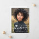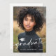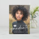 Cartão de lançamento fotográfico com a sua foto com o texto "formando" e um boné de formatura como uma camada branca. Adicione uma foto adicional e uma mensagem personalizada no verso.