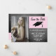 Graduação rosa moderna em quadro chalkboard Salve a placa de lançamento de fotos de data. Moderno salve o cartão de data para anunciar a festa de formatura do seu formando. A placa está em textura de quadro chalkboard cor-de-rosa e em moda e inclui um boné de formatura. O design tem texto de tendência - personalize todo o texto do cartão com seus dados e um modelo de foto - insira a foto do formando no modelo. Altere a data e outro texto na parte traseira do cartão.
