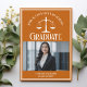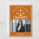 Este cartão de anúncio de graduação da escola de direito laranja personalizado apresenta tipografia branca para uma classe de formando 2025 acima da sua foto de estudante. Personalize com o seu ano de graduação sob as escalas de justiça e fotografia para um advogado personalizado ou cartão de advogado excelente.
