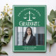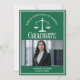 Este cartão de anúncio de graduação da escola de direito verde personalizado apresenta tipografia branca para uma classe de formando 2024 acima da sua foto de estudante. Personalize com o seu ano de graduação sob as escalas de justiça e fotografia para um advogado personalizado ou cartão de advogado excelente.