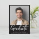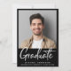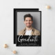 Anúncio de graduação em preto moderno com a foto do formando e o "Formando" em um roteiro contemporâneo em branco. Adicione seu nome, ano de aula e escola em uma simples tipografia branca.