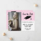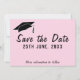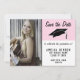 Graduação Rosa Salve a Data da Placa de Anúncio de Foto. Moderno salve o cartão de data para anunciar a festa de formatura do seu formando. A placa está em cor-de-rosa e branca e inclui um boné de formatura. O design tem texto de tendência - personalize todo o texto do cartão com seus dados e um modelo de foto - insira a foto do formando no modelo. Altere a data e outro texto na parte traseira da placa.