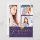 Este cartão de anúncio de graduação moderno com a coleção personalizada de 4 fotos será a escolha perfeita para enviar para a sua família e amigos. A frente do cartão tem três fotos para você mudar para seu próprio bordado em roxo. Abaixo do moderno faux gold script, lê-se "Formando" com ano de aula, nome e escola para personalizar. A parte de trás da placa tem uma quarta foto com mais detalhes sobre sua graduação e planos futuros para personalizar. Parabéns pela sua formatura! Desenhada por Susan Coffey.