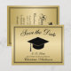 Anuncie sua próxima formatura em estilo e faça seus parentes e amigos salvarem a data com esta elegante carta chata. O design apresenta um fundo dourado falso com as palavras "Salvar a Data" no script preto. Um simples boné de formatura preto está no centro e abaixo está a data e o seu nome para personalizar. A parte traseira do cartão tem mais informações para você personalizar também. Desenhado pela artista ©Susan Coffey.