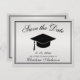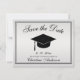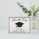Anuncie sua próxima formatura em estilo e faça seus parentes e amigos salvarem a data com esta elegante carta chata. O design apresenta um fundo falso prateado com as palavras "Salvar a Data" em um script preto. Um simples boné de formatura preto está no centro e abaixo está a data e o seu nome para personalizar. A parte traseira do cartão tem mais informações para você personalizar também. Desenhado pela artista ©Susan Coffey.
