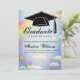 Anuncie seu formandos à família e amigos com este elegante cartão de anúncio e convite de festas. Este design moderno apresenta um boné de formatura preto sobre um fundo de um arco-íris e céu azul com seus detalhes em um roteiro preto abaixo. A parte traseira da placa tem uma convite de festas para você personalizar. Parabéns na sua formatura! Projetado pelo artista Tim Coffey.
