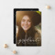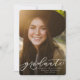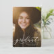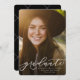 Um formando de script simples, mas lúgubre, fica na parte inferior de uma foto vertical. O texto personalizado inclui espaço para o nome do formando e também detalhes escolares e do ano. O backer neutro da cinza tem um padrão de grade simples, e a cor pode ser alterada clicando em "personalizar ainda mais". Uma maneira excelente de anunciar a realização do seu formando aos amigos e à família!