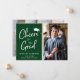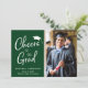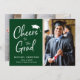 Cartão de anúncio de graduação verde 2 para caçadores modernos. A frente apresenta a foto do formando, "Saúde ao Formando" em um roteiro branco moderno, e uma ilustração branca do boné formando. Personalize facilmente com seu nome e escola, e adicione uma foto adicional no verso.