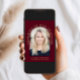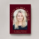 Cartão de anúncio vermelho de burgundy elegante com fotografia do formando em um quadro de arco e "Parabéns ao Nosso Formando" em tipografia de serifa dourada. Adicione seu nome, ano escolar e ano de aula em uma simples tipografia de ouro.