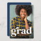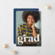 Com um formando retrô ousado em branco, este cartão com fotos vertical é a maneira perfeita de anunciar seu formando para a família e os amigos. O estilo de safra é sutil e simples para este anúncio de graduação e perfeitamente sobre a tendência para esta turma de graduação. A parte traseira desta placa é azul marinho com textura esfolada. A cor azul pode ser alterada clicando em "personalizar mais".