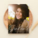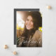 Um formando clássico e elegante em branco fica no fundo de uma foto vertical. O texto personalizado inclui espaço para o nome do formando e também detalhes escolares e do ano. O backer da cinza de carvão negro tem um padrão de grade simples, e a cor pode ser alterada clicando em "personalizar ainda mais". Anuncie a realização do seu formando aos amigos e à família com este design!