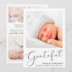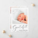 Um anúncio simples e elegante de parto de bebê neutro em termos de gênero. A frente apresenta a foto do seu recém-nascido, o nome do cheio, a data de chegada e as estatísticas de natalidade, e "Grateful" escrito em um roteiro de na moda com um coração florescente. No verso do cartão, adicione três fotos adicionais e nomes de pais e irmãos, e um obrigado para você, visitação ou outra mensagem.