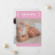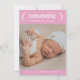 O anúncio de nascimento de uma garota personalizado com uma foto no cobrir e mais três fotos no verso. O nome de sua menina em branco embaixo de uma fonte de mão encantadora dizendo Introdução, e estatísticas de natalidade na parte inferior do cartão de nascimento da menina. Um belo anúncio de uma nova menina em cor-de-rosa e branca com um belo verde e fontes.