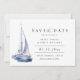 Iate de aquarela elegante, Salve o Cartão de Data. Design de tipografia elegante e moderna. A cor de backup, mostrada em azul marinho, pode ser personalizada.