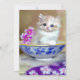 Cartão com um gatinho branco fofo! O gatinho de olhos azuis fica em uma tigela azul com flores cor-de-rosa. Um cobertor com flor púrpura é cortado na frente. Um presente maravilhoso para amantes de gatos e entusiastas de arte vitorianos!