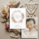 Um lindo película de cor d'água tem o anúncio de nascimento floral da coroa, e uma doce foto de bebê do outro lado.