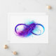 Símbolo infinito com uma bela pena pintada em cores roxas e azuis brilhantes sobre fundo branco.