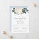 Arranjo floral em aquarela em tons de branco, rosa, azul e verde, convite para jantar de ensaio. Design de tipografia cinza chic e moderno. Parte de trás do cartão apresenta cor azul claro em pó sólido.