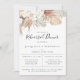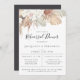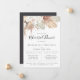 Folhagem em forma de boêmia com aquarelas e arranjo floral de orquídeas brancas, rosas cor-de-rosa e palmeiras secas, convite para ensaio jantado. Design de fotografia e tipografia moderna. A parte traseira da placa apresenta cor sólida de onyx preto. Projetado para combinar com nossa Coleção de Oásis Boêmia.