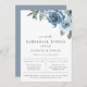 Disposição floral de aquarelas em tons de azul empoeirado e verde, convite de janto de ensaio. Design de fotografia e tipografia moderna. A parte traseira da placa apresenta cor azul empoeirada sólida.