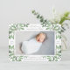 O anúncio de nascimento botânico elegante, em tons chic de verde, apresenta uma foto horizontal ou paisagística de cheio com sombreamento de folhas verdes de aquarelas da floresta e bagas brancas nos cantos. Personalize com o nome do bebê, estatísticas de natalidade e uma mensagem pessoal, e adicione três fotos quadradas adicionais às costas.