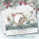Cartão de Natal de novo lar com carta decorativa, seu novo endereço e cartões de natal. A design de aquarela exibe a palavra JOY sobre uma floresta florestal e decorada com aves, bagas de inverno, verde festivo e cones de pínus.