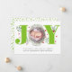 Verde limão Joy com bagas Primeira foto de Natal Anúncio de nascimento de bebê Feriado. Mostra a palavra "JOY" com bagas vermelhas e verde enquanto em vez da letra "O" está a sua foto. O verso inclui bolinhas verdes.