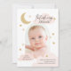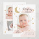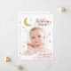 Um design de anúncio de nascimento divertido, mas elegante, que apresenta sua foto em forma de arco com roteiro de na moda caligrafia e estrelas desenhadas à mão, nuvens e lua crescente. A parte de trás apresenta uma colagem de 3 fotos e mais estrelas. Visite a coleção para ver mais.