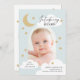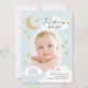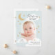 Um design de anúncio de nascimento divertido, mas elegante, que apresenta sua foto em forma de arco com roteiro de na moda caligrafia e estrelas desenhadas à mão, nuvens e lua crescente. A parte de trás apresenta uma colagem de 3 fotos e mais estrelas. Visite a coleção para ver mais.