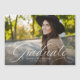 Um formando clássico e elegante em branco fica no fundo de uma foto horizontal. O texto personalizado inclui espaço para o nome do formando e também detalhes escolares e do ano. Este cartão magnético é a forma perfeita de anunciar a realização do seu formando aos amigos e à família!