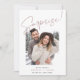 Ainda não marcou a data, mas não pode esperar para compartilhar as boas notícias com a família e os amigos? Anuncie sua noivado com esses cartões com fotos simples e leves, com uma foto vertical ou orientada a retratos com "surpresa!" sobreposta no topo com a letra esboçada à mão. Personalize com três linhas de texto personalizado na parte inferior, incluindo seu anúncio, nomes e uma nota para ficar sintonizada para mais detalhes.
