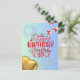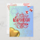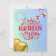 Frente: a placa tem um fundo azul claro. No centro, há um grande texto vermelho que lê "Parabéns para você", decorado com estrelas brancas e vermelhas. Acima do texto, há dois fogos de artifício brancos, e espalhados ao redor estão estrelas pequenas. À direita, há duas caixas-presentes com fitas vermelhas, e no canto inferior esquerdo, há um balão em forma de ouro. Back: Há uma caixa de presentes e ursos de pelúcia falsamente impressos, juntamente com as frases "desejamos o melhor" e "faça um desejo e comemore seu dia especial" em uma fonte elegante.