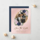 Elegante marinho azul, rosa-pincelado e foto de casamento dourado salve o cartão de data com um quadro de fotos dourado moderno, adornado com flores azuis e cor-de-rosa e verde.