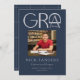 Estes modernos marinhos azuis e cinzas 5" x 7", anúncios de graduação, contêm a palavra "Formando" em um design abstrato. Insira uma de suas fotos favoritas junto com seu nome, ano de graduação, escola, grau e área de foco. A parte traseira tem uma simples design de linha de cinza sobre um fundo azul marinho.