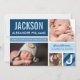 Anuncie a chegada do seu bebê em estilo com simples cartões de anúncio de nascimento que apresentam três fotos do seu bebê numa colagem moderna de blocos coloridos com stripes design. Marinho azul, azul-nuvem, azul-claro e branco.