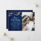 Casamento azul-rusticado personalizado salva os cartões de data com madeira de celeiro e luzes de cordas. Este casamento azul marinho, salvar o cartão de data é perfeito para um país marinho e rústico, quintal, jardim ou festa de casamento de celeiro.