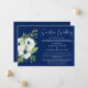 Se as circunstâncias exigirem que você diminua o tamanho do seu casamento, você pode informar sua lista de convidados estendida original com este anúncio de casamento menor e bonito com um buquê floral de cor d'água de flores anêmonas brancas e verdes, "Casamento menor" escrito em um roteiro branco na moda e uma simples tipografia branca contra um elegante fundo azul marinho. Você pode personalizar sua mensagem de tamanho inativo do casamento em mais detalhes e adicionar qualquer informação do site da cerimônia de transmissão em direto e do casamento.