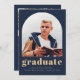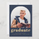 Este anúncio de formatura simples e minimalista apresenta uma foto em forma de arco na frente e uma foto horizontal na parte de trás. A palavra "formando" aparece em negrito tipografia dourada, com o nome do formando, a escola e o ano em sans serif, sobre fundo azul marinho. Adicione uma mensagem mais detalhada sob a foto no verso.
