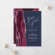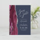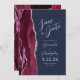 A borda esquerda deste elegante casamento moderno salve o cartão de data apresenta uma borda vermelha e borrifada de cor-d-água, aparada com falso brilho prateado. O texto personalizável combina o script de cinza prateada e as fontes sans serif em um fundo azul marinho. O lado inverso apresenta um design de burgundy e agate prateado.
