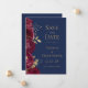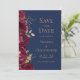 Este elegante casamento moderno salve o cartão de data mostra uma borda de flores burgundy e folhas de folhas falsas de ouro. Personalize o texto dourado em um fundo azul marinho. A parte traseira da placa é azul marinho estável.