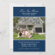 O anúncio simples e móvel apresenta o título personalizado "Nossa nova casa" no script, a foto da sua nova casa enquadrada em uma borda listrada por pinos, o texto personalizado em branco e uma cor azul de fundo marinho de safira. Outras cores estão disponíveis no repositório de Papel de Push e quando solicitado.