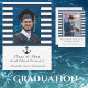 Um anúncio de graduação em Marinho azul e listras brancas moderno, apresentando um quadro sobre sua escolha de foto. A parte traseira apresenta outra foto e mais detalhes sobre seu formando.