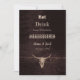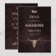 Textura marrom rústica imprime crânio de touro. Design de madeira country western cowboy coma bebida casado divertido. Anúncios de casamento exclusivos em cartões planos. Use um pouco de humor com esses convites engraçados em estilo fazenda. Coma, Beba, porque estamos nos casando pode ser personalizado. Tendência, velho oeste selvagem vintage antigo inspirado. Animal de fazenda legal. Personalize a escrita e a tipografia. Direitos autorais da imagem Marg Seregelyi Photography.