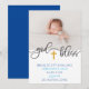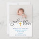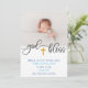 Este doce anúncio de nascimento apresenta uma foto de solteiro no topo e informação de nascimento no fundo. O meio da design apresenta texto que diz "deus abençoe" com uma cruz de ouro simulada.